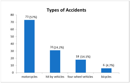 The accident sites included expressways (n = 31/24.2%), low-speed roads (n = 25/19.5%), medium-speed roads (n = 17/13.3%), intersections (n = 11/8.6%), sidewalks (n = 7/5.5%), others (n = 9/7%), not informed (n = 28/21.9%).