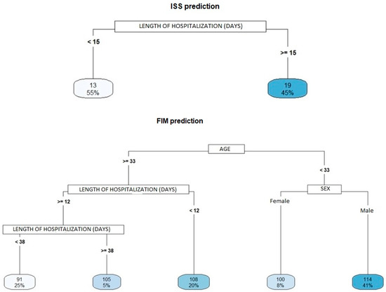 Decision tree to identify ISS predictive variables (injury severity) and FIM (disability).