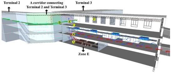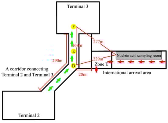 There were three floors in the international arrival area, each of which was approximately 5 m high, and the overall height of the building was 19.2 m. Zone E (first floor) was the hall for inbound passengers’ rest and waiting for their baggage to transfer. The second floor was the international arrival corridor. The third floor was the international departure corridor and the international airport terminal. The three floors were connected by rolling elevators. Figure 1 shows the course of action for inbound passengers and domestic passengers that day. After the arrival of the international flight, inbound passengers need to go through an entry declaration, first temperature measurement, an epidemiology survey, nucleic acid sampling, customs inspection, secondary temperature measurement and border inspection at the international arrival corridor on the second floor, then go downstairs to Zone E (first floor) to wait for the transfer.
