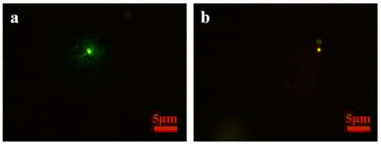 Representative photos of fluorescent microspheres tracked by different sampling methods in different sites. After aerosolization of fluorescent microspheres, fluorescent microspheres (green and yellow) were detected in (a) the filter membrane of an air sample using PM10 samplers (100 L/min) under fluorescence microscopy and (b) the liquid of an air sample using biological aerosol samplers (100 L/min) under fluorescence microscopy.