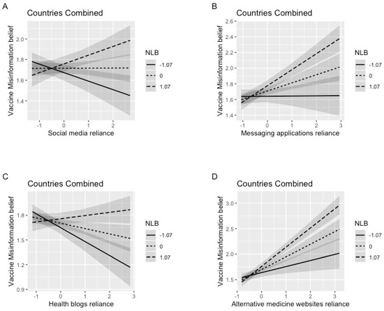Two-way interaction between media reliance and NLB on vaccine-related misinformation belief (Combined sample). Note. Plots represent marginal effects at − 1 SD, Mean, and +1 SD. Figure A–D represents the interaction between NLB and reliance on (1) social media, (2) messaging applications, (3) health blogs and (4) alternative medicine website individually.