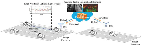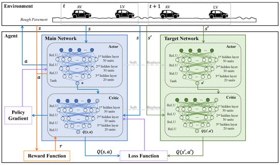 In this study, we proposed an intelligent speed control approach for safe, efficient, and comfortable car-following on rough pavements using the DDPG algorithm. As shown in Figure 1, the proposed speed control approach is applied in a cooperative vehicle infrastructure system (CVIS). In this system, AVs detect road profiles using onboard light detection and ranging (LiDAR), accelerometers, and global positioning systems (GPSs) and then send them to roadside units (RSUs) via vehicle-to-infrastructure communication. Dynamic traffic information can be detected by roadside sensors [13,14,15,16,17]. Furthermore, the multi-source road and traffic information is uploaded to the cloud server for integration. When an AV enters the road, it receives complete road profiles of the pavement. The AV then extracts the road profiles of the left and right wheels along the trajectory and calculates comfortable speeds on segments by vertical comfort evaluation. Meanwhile, the AV receives the location and speed information of surrounding vehicles, especially the leading vehicle, via vehicle-to-vehicle communication. Finally, the DRL-based speed control observes the information on comfortable speeds and leading vehicle and recommends accelerations. The AV adjusts driving speed to achieve safe, efficient, and comfortable driving according to recommended accelerations.