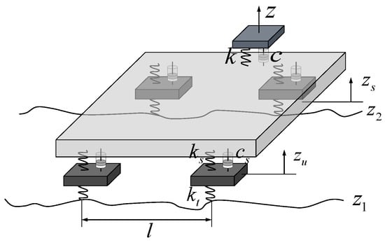 On rough pavements, irregular road profiles often lead to discomfort in the vertical direction. For a vehicle, vertical ride comfort is directly related to the vertical vibration of the seats, which results from the interactions between the seats, vehicle body, suspensions, tires, wheels, and road profiles. The interactions are formulated as mathematical models [5,7]. Since the most commonly used model, the quarter-car model, is too simple to reflect the entire vibration information, a full-car model with a seat modeling is used (see Figure 2) [7]. The dynamic equation of the full-car model is summarized as