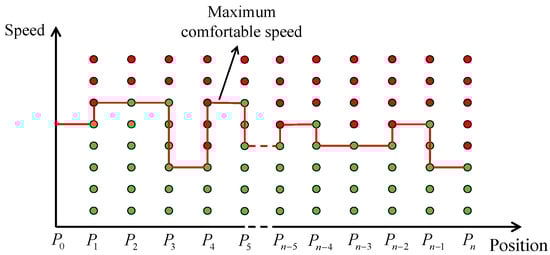 In this study, the annoyance rate is calculated with a specific length according to conventional road quality evaluation [12]. For example, the road profiles along the driving trajectories are divided into several segments with equal lengths, and the annoyance rate is calculated based on speeds and spatial road profiles in each segment. The intelligent speed control aims to confine the annoyance rate to below 20% to satisfy most passengers [19]. Specifically, the control strategies should ensure that 80% of passengers would be comfortable or not annoyed. The speeds satisfying the standard are regarded as prior knowledge of vertical comfort and directly induce the speed control of AVs. As shown in Figure 3, we calculate the annoyance rates at different speeds and record them at the end of each segment. The green circles indicate annoyance rates below 20%, while the red ones indicate annoyance rates above 20%. The maximum speed on each segment, maintaining the annoyance rate at 20%, is the maximum comfortable speed (MCS). The MCS provides prior knowledge of vertical comfort and works as a reference speed for real-time speed control.