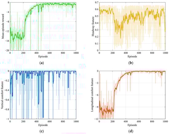 Training trajectories of the DDPG model: (a) mean episode reward, (b) headway feature, (c) vertical comfort feature, and (d) longitudinal comfort feature.