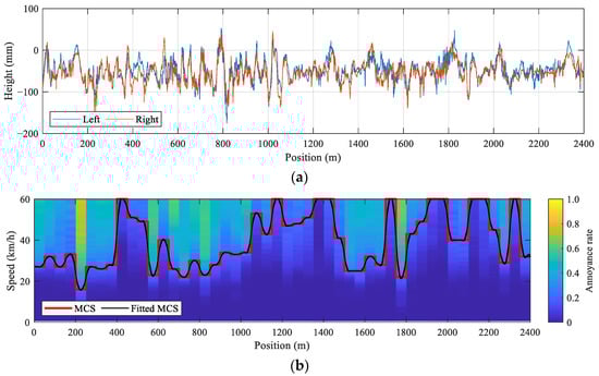 To compare driving performances, we conducted experiments using a sampled rough pavement and the testing set of the NGSIM data. Our rationale for this was that 44,330 combinations of rough pavements and leading vehicles exist when AVs start at the same location on each pavement. Since the driving speeds of leading vehicles in the testing set range from 0.0722 to 61.0570 m/s, the deviation between AVs’ speeds and the MCS varies, although the same pavement is used. Since the number of combinations of rough pavements and leading vehicles is large, we sampled an extremely rough pavement from the dataset for testing. The sampled road profiles of left and right wheels, annoyance rate analysis, and MCS of the Yangshupu Road is shown in Figure 7. Specifically, the MCS is fitted using B-spline interpolation to provide precise information for speed tracking, called the fitted MCS [12].