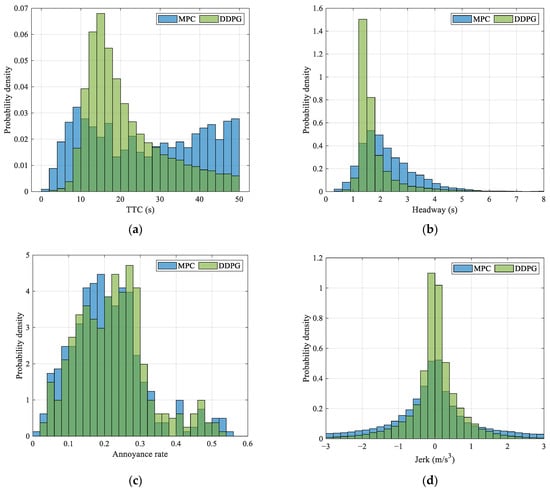 Probability density distribution of (a) TTC, (b) time headway, (c) annoyance rate, and (d) jerk.