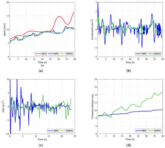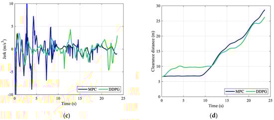 We further tested the model with different starting points to show the details of the speed control results. In Figure 9a, the speeds of the leading vehicle are below the fitted MCS, indicating that the main task of the AV is to follow the leading vehicle. As shown in Figure 9b,c, the DDPG model can generate lower absolute values of jerk and acceleration. Thus, Figure 9a indicates that the speed profile generated by the DDPG model is smoother. Consequently, the space of the DDPG model is much larger than the MPC baseline. Unlike the example in Figure 9, some of the fitted MCS values in Figure 10a are below the leading vehicle’s speeds. The AV should balance driving efficiency and ride comfort. Figure 10d shows that the MPC baseline first follows the leading vehicle at a certain clearance distance and then adjusts its speed to improve vertical comfort. Compared to the MPC baseline, the DDPG model can maintain a relatively large clearance distance for safety. Meanwhile, the DDPG model has lower absolute values of jerk and acceleration when following the leading vehicle. With sufficient space between two vehicles, the AV can adjust its speed in advance for better vertical comfort in future situations (see Figure 10b,c).