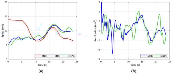 MPC is the most common speed control method to achieve multi-objective car-following behavior, including safety, efficiency, and comfort [4,28,29]. At each timestep, MPC solves an optimal control problem in a prediction horizon and generates an acceleration sequence. The first in the sequence is then conducted. This optimization process is repeated until the termination conditions are satisfied. Since MPC-based speed control can handle constraints and perform predictive control, it functions as a baseline for performance comparison with the DDPG model [12]. The kinematic point-mass model mentioned in Section 3.1 is described in a vector form:
