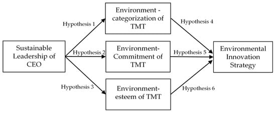 First, sustainable leadership can shape the TMT’s behaviors and values toward the sustainable development values of the organization [32], so the TMT’s self-concepts will meet environmentally sustainable development, which is similar to the concept of environmental self-categorization. We address the first hypothesis as follows: