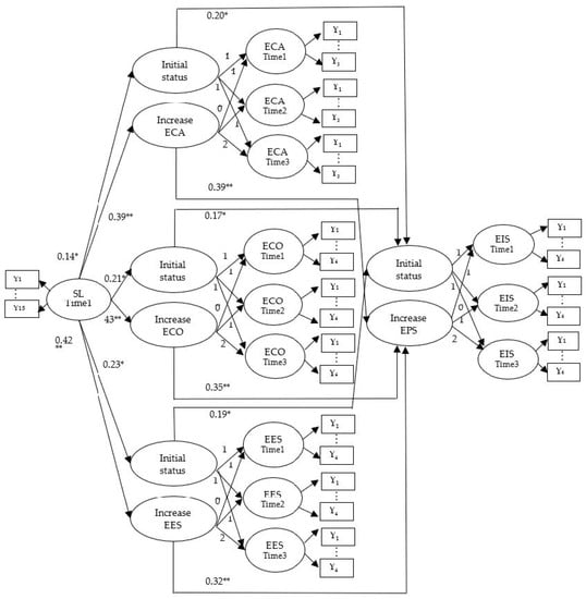 The latent growth curve model of this paper. Note: SL = sustainable leadership; ECA = environment categorization; ECO = environment commitment; EES = environment esteem; EIS = environmental innovation strategy. Yn = measurement items. * p < 0.05; ** p < 0.01. Time 2: three months after Time 1; Time 3: three months after Time 2.