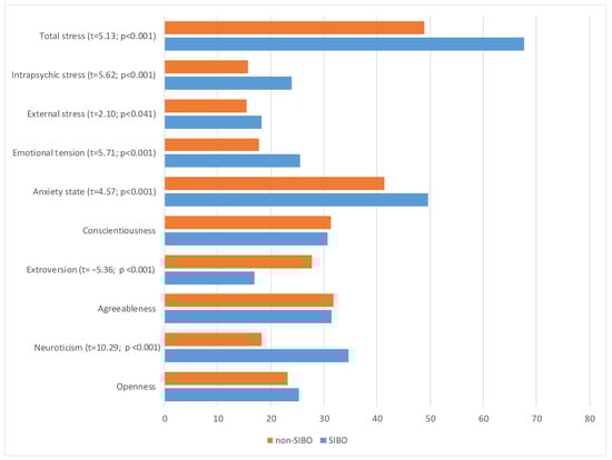 In the SIBO subgroup, in comparison to the non-SIBO subgroup, significant differences in personality traits (see Table 2 and Figure 1) were found: higher neuroticism (t = 10.29; p < 0.001), and lower extroversion (t = −5.36; p < 0.001). The strength of the recorded effects, as measured by Cohen's d coefficient, was very high. The higher anxiety-state was also discovered (t = 4.57; p < 0.001) as well as all stress indicators: emotional tension (t = 5.71; p < 0.001), external stress (t = 2.10; p < 0.050), intrapsychic stress (t = 5.62; p < 0.001), and total stress (t = 5.13; p < 0.001). The strength of the observed effect for the level of external stress was moderately high, while it was very high for the other three variables.