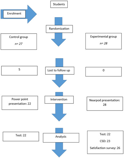The subjects were randomly divided into two groups by means of opaque envelopes. These were given to a professor who was not involved in the project. He was in charge of shuffling the envelopes and handing them out randomly to the students. The envelopes were marked with a “C” or “N.” Students with a “C” were assigned to the control group (n = 27), and those with an “N” on the envelope were assigned to the experimental group (n = 28). On the day of the test, 5 students from the control group were absent from class, leaving 28 students in the group that had the Nearpod presentation and 22 in the group that had the PowerPoint presentation (Figure 1). This project was carried out during two hours of theory. In one of the hours, the control group was with a subject teacher conducting a discussion on a topic unrelated to musculoskeletal disorders, while one of the project teachers was in another classroom with the experimental group using Nearpod. In the next hour, the control group went on to teach the musculoskeletal disorders class in the traditional way with the project teacher, and the experimental group went to the second classroom to conduct the discussion with the other subject teacher.
