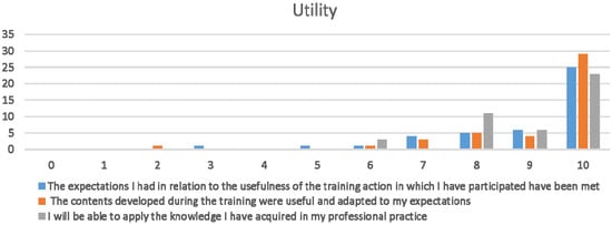 The CSD was answered by 23 students. In Figure 2, the answers obtained by the students to the questions referring to the “Utility” module can be observed. In all 3 items, the results are higher than 7. This is supported by the average of the first question, “The expectations I have fulfilled”, which provides a value of 8.8; the second question, “The contents developed have been useful”, has an average of 9.1, and the last question obtains an average of 9.06. All these data indicate that the surveyed students consider the application of Nearpod useful.