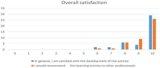 Figure 3 shows students’ overall satisfaction and whether they would recommend the techniques used in class to other professionals. An average value of more than 9 points was obtained in both cases, which is considered very high. This indicates that students are very satisfied with the use of the application.