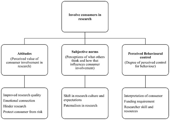 However, studies have not yet offered an integrated model for understanding the factors that influence the behaviour of involving consumers in research. The theory of planned behaviour (TPB), a generalised belief-based theory developed by Ajzen [15], provides a framework to identify sets of personal-, social-, and control-related factors that impact the behaviour and mechanisms involved [16]. TPB proposes that individuals’ intention to engage in or stop specific behaviours can be predicted by their attitude, subjective norms, and perceived behavioural control [15]. These constructs determine how favourable or unfavourable an individual’s evaluation is of the behaviour, the degree of influence that external social factors have on the behaviour, and the perception of ease in performing the behaviour, respectively. TPB helps to identify the psychological constructs related to behaviours and map the processes by which the constructs relate to this behaviour [17,18,19].