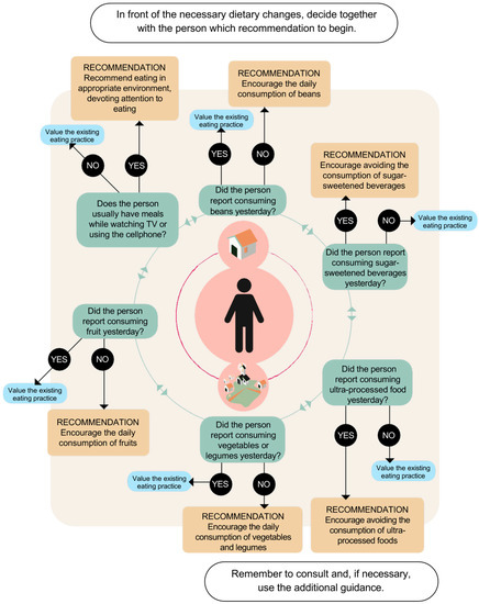 The protocol format consisted of the following sections: 1. Introduction—with a brief elucidation of the clinical and epidemiological aspects of DM, the DGBP, and the protocol’s aim; 2. “How to use the protocol?”—step-by-step instructions on how to use the protocol for Brazilian PHC professionals; 3. The instrument for assessing Food Consumption—The Food Consumption Markers instrument chosen was the form used in the Brazilian Food and Nutrition Surveillance System (in Portuguese: Sistema de Vigilância Alimentar e Nutricional (SISVAN)) [14], considering the ease in fulfilling it and already used in PHC instruction [15]; 4. Flowchart—A circle model flowchart centered on the patient’s decisions alongside the PHC professional was elaborated to guide the health professional to dietary recommendations, reinforcing the patient’s autonomy in their health care; 5. Dietary recommendations; 6. Final messages.