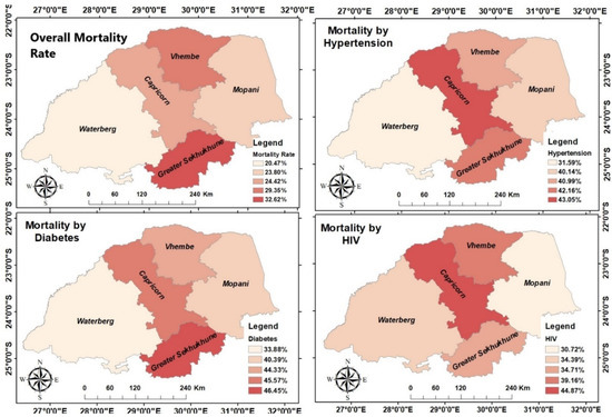 A total of 15151 COVID-19 cases were reported from March 2020 to September 2022. Mortality rates among hospitalized COVID-19 patients ranges were observed overall (20.47–32.62%), by hypertension (31.59–43.05%), diabetes (33.88–46.45%), and HIV (30.72–44.87%). In general, the spatial analysis indicated an unbalanced geographical distribution of mortality rate among hospitalized COVID-19 patients in Limpopo province, with a high mortality rate in the South part of the province. The Sekhukhune district had the highest incidence among the five districts, followed by the Vhembe district. In terms of mortality rate by hypertension and HIV among hospitalized COVID-19 patients, the Capricorn district had the highest incidence rate, followed by Vhembe and Sekhukhune districts. For mortality rate by diabetes among hospitalized COVID-19 patients, Sekhukhune district had the highest incidence, followed by Capricorn and Vhembe districts, shown in Figure 1.