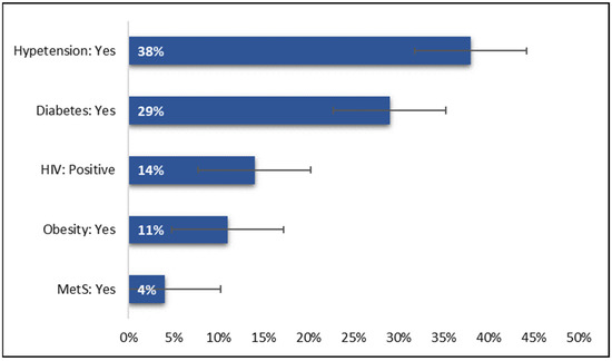 In South Africa, 5% to 62% of adults suffer from MetS, depending on the subgroup that is studied [25,26,27,28,29]. Although research is minimal on its association with COVID-19, provincial data on COVID-19 fatalities suggest that people with diabetes are more likely to die from COVID-19 than any other high-risk group [30]. In a USA study, adult patients of African origin with MetS were 3.4 times more likely to die from COVID-19 than those who did not have the condition. Patients with MetS were also nearly five times more likely to be admitted to an ICU, need a ventilator, or develop acute respiratory distress syndrome [31].