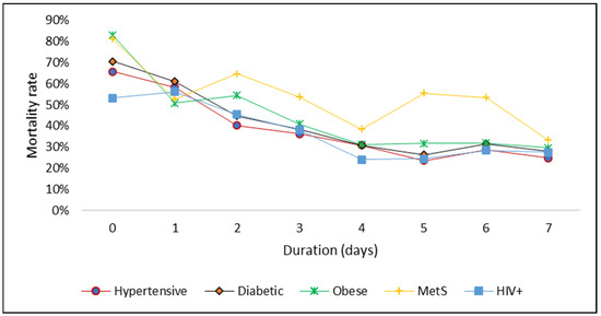 The COVID-19 pandemic has likely been substantially exacerbated by pre-existing NCDs, which might be important risk factors for severe clinical complications and outcomes in patients with COVID-19. Clustering of these NCDs and risk factors collectively called MetS [12]. MetS showed to have higher mortality within seven days of admission in this study. A systematic review and meta-analysis on MetS and its components in patients with COVID-19 [73] highlighted that patients with MetS exhibited four times greater odds of severe and fatal COVID-19 outcomes compared with those without MetS. In addition, the odds of mortality with MetS components showed an increased mortality risk as the components’ count increased, and patients with MetS had increased mortality, higher ICU admission, and increased need for mechanical ventilation [73]. This suggests that MetS should be considered a composite predictor of COVID-19 lethal outcome, increasing the odds of mortality by the combined effects of its components.