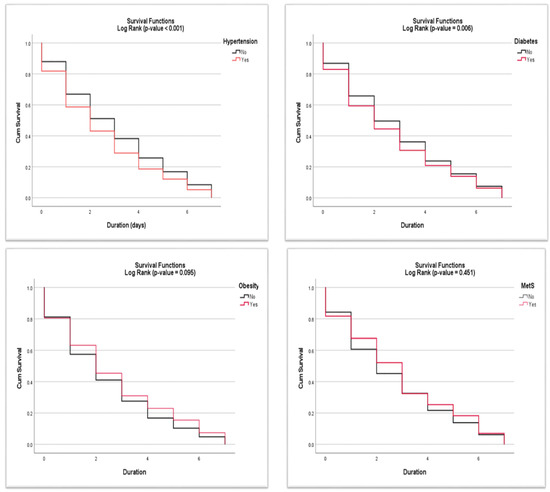 It can be observed that the cumulative survival proportion appears to be much higher in the non-hypertensive and diabetic groups compared to the hypertensive and diabetic groups, respectively. In the overall comparisons using the log-rank test, the p-value was found to be less than 0.05 for both hypertension and diabetes-independent variables. This concludes that there is a statistically significant difference in time-to-event between the independent groups (hypertension vs. non-hypertensive and diabetic vs. non-diabetic). The hypertensive and diabetic patients diagnosed with COVID-19 significantly shortened the time until participants die compared to the other groups. There was no significant difference in time –to the event between the independent groups for obesity and MetS independent variables.