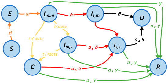 8]. They typically consist of a collection of equations for state changes that represent various chamber states and inter-chamber transitions. The transfer equation is a series of ordinary differential equations that describes how the number changes over time. The number of chambers indicates the population of that state. Flexible changes can be made to the chamber’s configuration to accommodate various research goals, as well as various infectious features [