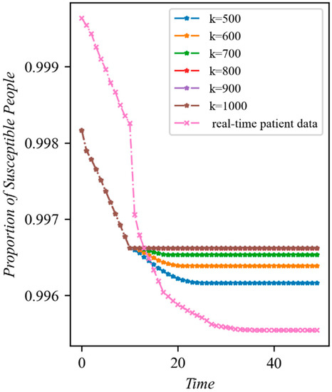 Figure 4. Generally speaking, the share of the sensitive population that remains after the epidemic has stabilized increases as the number of new medical resources increases, and the tendency of susceptibility to reduce is greatly restrained following the closure of the Fangcang hospital. More specifically, the larger the proportion of the susceptible population is once the epidemic stabilizes, the more noticeable the change in the decreasing trend observed in the susceptible population is, and the sooner the epidemic reaches stability. Finally, the proportion of sensitive individuals in