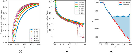 (ii): Impact of the use and distribution of medical resources. This section investigates whether changing medical resource allocation and use have an effect on stopping the epidemic’s spread. Specifically, we set , and observe the changes in the proportion of remaining susceptible people after the epidemic stabilizes under different conversion rates or allocation ratios. It was expected that the proportion of still-infected people would keep rising as the conversion ratio increased, indicating that increasing the conversion ratio could help contain the epidemic spread. The proportion of susceptible people under different conversion ratios demonstrated that improving the Fangcang shelter hospital’s workflow could help to contain the epidemic and prevent spread. The marginal changes in the proportion of susceptible individuals and the proportion of susceptible individuals with the change in the distribution ratio at different distribution ratios are proof that the distribution ratio represented by Equation (5) satisfies the relationship. It is expected that the number of remaining susceptible individuals will rise and then fall as the distribution ratio increases.