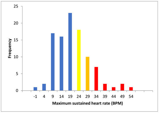 In total 13 of the 100 patients (10 female and 3 male) showed haemodynamic trends consistent with PoTS at the sustained 30 BPM threshold (T30). In addition, 10 (8 female and 2 male) had an upper limit of normal value tachycardia at T25, and an additional 18 (12 female and 6 male) at T20. A total of 41 patients therefore showed a sustained HR increase by at least 20 BPM. Figure 1 shows the frequency distribution of the maximum sustained HR. Nineteen patients had a (non-sustained) maximum rise of 30 BPM.