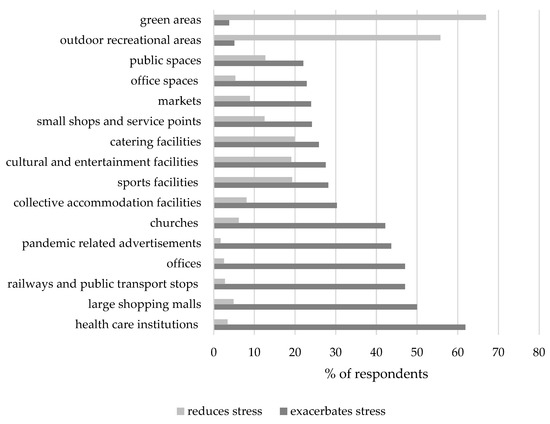 The most stress-inducing socio-psychological elements in the urban environment during the pandemic were the economic slowdown, real and foreseen financial losses, isolation accompanying quarantine, supply shortages, uncertainty, loneliness, fear of infection, stigma associated with contagion or its risk, resulting in social phobia, and boredom [