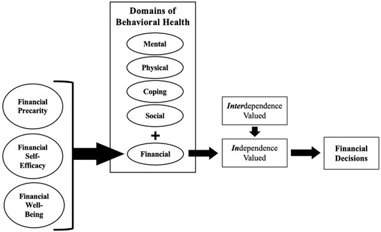 The perception of financial experiences, money-related habits and attitudes, and the resulting sense of security, or lack thereof, are subjective and positioned according to one’s internal frames of reference. One’s relationship with money responds, at an individual and family level, to behavioral interventions (such as financial coaching or cognitive behavioral therapy) [10]. As these subjective financial elements intertwine with the other behavioral health components and likewise contribute to health and well-being, it is proposed that FBH be included as an additional domain to those that are considered to comprise behavioral health. Initially, elements of FBH could include FP (a state in which both material and psychological well-being are impacted by negative financial conditions and perceptions), FSE (the ability and confidence to make financial decisions and perform financial tasks) [11], and FWB (the measure of one’s sense of security and freedom of choice, both in the present and future) [12].