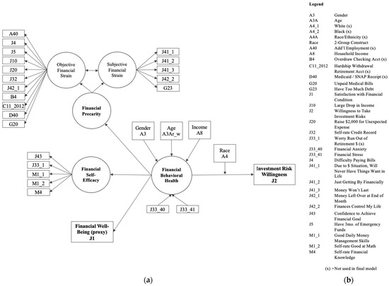 Outcome Variable. FBH was the main construct, as a second-order latent variable. Per the definition used in this study, FBH entailed the contributions of FP, FSE, and FWB (using financial satisfaction as a proxy). Financial anxiety and financial stress were initially modeled with regression as directly influencing FBH. This was in alignment with recent findings by scholars using the same NFCS data set in which certain items from the FP and FSE concepts were associated with financial anxiety and financial stress [51]. Financial anxiety was measured using response scores to the statement “thinking about my personal finances can make me feel anxious” that ranged from 1—strongly disagree to 10—strongly agree. Financial stress was measured using response scores to the statement “discussing my finances can make my heart race or make me feel stressed” that ranged from 1—strongly disagree to 10—strongly agree. In both cases, higher scores suggested higher anxiety and stress levels.