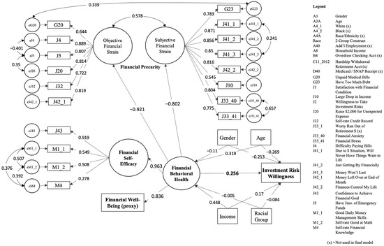 FSE was also assessed using an EFA to CFA approach with the available measures from the data set that reflected concepts associated with existing measures of this construct [11,32]. FSE was expected to be positively related to the respondents’ rating of FWB (as financial satisfaction). See Table 1 for the list of FSE variables assessed.