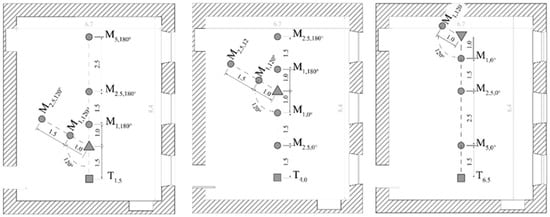 - The receiver (R) consisted of a Brüel & Kjær (B&K) Head and Torso Simulator (HaTS), which allowed for the recording of binaural room impulse responses (BRIRs). The HaTS was placed in the classroom in order to guarantee that its ears were at 1.5 m from the floor. Furthermore, it was then placed at increasing distances from the T source, i.e., at 1.5 m, 4.0 m, and 6.5 m, referred in the following as T1.5, T4.0, and T6.5, respectively.
