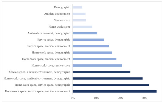 Among factor sets, specifically, the contribution of a two-set combination, home–work space and service space (20.5%), is 6.7% higher than the sum of their separate contributions (13.8% = 8.2% + 5.6%). This observation may imply reinforced health risks involved in the two spaces. Although the effect of the home–work space is more dominant, the “supplement” contribution of the service space is noticeable. While in the home–work space, commuting spreads the infection to rather fixed pairs of locations regularly, service places serving as hubs can connect a large number of homes and workplaces dynamically, causing the transmission to a broad range of locations throughout an urban area. These reinforced health risks can be vital to the population’s health in complex urban environments. For all other two-factor set combinations, compound effects are also observed, varying to different degrees.