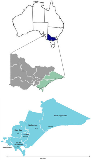 The Gippsland region is located in the southeastern corner of the state of Victoria and covers 41,600 square kilometers, with a population of over 270,000 [26]. It extends from about 100 km southeast of Melbourne to the east and the New South Wales border to the west. The median personal, family, and household income levels for Gippsland are below those of both the state and national rates [26].