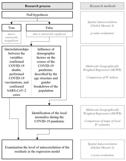 The first step in the research process was to determine the statistical significance of the analyzed variables using the null hypothesis. This step was accomplished using the spatial autocorrelation tool (Global Moran’s I), by evaluating the p-values. Only after rejecting the null hypothesis was it possible to accomplish research objectives #1 and #2, using multiscale geographically weighted regression (MGWR) by comparing R2 indices. Next, research objective #3 was accomplished, again using MGWR, but by comparing maps of local R2 estimates. The final step of the analysis was to examine the validity of the applied regression model by testing the level of autocorrelation of the residuals in the model, using the spatial autocorrelation tool (Global Moran’s I), and by evaluating z-score indices. To summarize and outline the research process and accompanying research methods, these elements are presented in the graph in Figure 1.