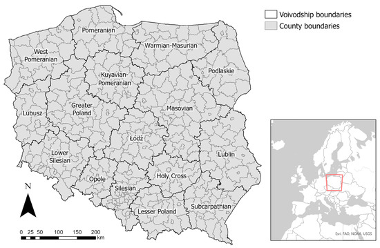 In terms of administrative division, the territory of Poland is divided into three levels: voivodships, counties, and municipalities. The first level (‘voivodships’) is the largest in the area and represents large regions; the third level (‘municipalities’) is the smallest in the area and represents towns or rural areas. The second level, the county level, is the most detailed level for which data over the course of the COVID-19 pandemic have been published in Poland: the number of confirmed SARS-CoV-2 cases, the number of confirmed COVID-19 deaths, and the number of COVID-19 vaccine doses administered. For this reason, and because of the high precision of the analysis based on the level of the county, this level was chosen for further study. Poland is divided into 380 counties with an average area of approximately 822 square kilometers (with a standard deviation of 520.55); a high number of analyzed counties is advantageous in this because the chosen regression model requires a large amount of data to achieve the best results [61]. Figure 2 presents the study area—the borders of the counties and voivodships in Poland.