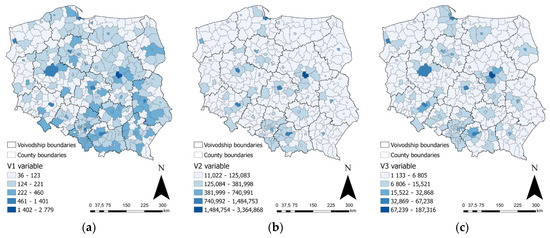 The number of confirmed COVID-19 deaths (a), the number of COVID-19 vaccine doses administered (b), and the number of confirmed SARS-CoV-2 cases (c), in counties of Poland in 2021. Source: own elaboration using ArcGIS Pro 3.1 by Esri, based on [63,64].