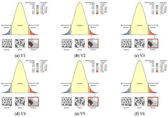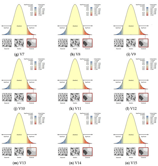 Spatial autocorrelation analysis was performed using ArcGIS Pro 3.1 software to assess the probability of the null hypothesis being true or false. The null hypothesis states that the analyzed data are statistically insignificant, and the results obtained from the data are a result of random chance. The spatial autocorrelation (Global Moran’s I) tool measures spatial autocorrelation based on feature locations and feature values, and assesses whether the expressed pattern is clustered, dispersed, or random. Figure 4 presents spatial autocorrelation (Global Moran’s I) reports of the analyzed variables.