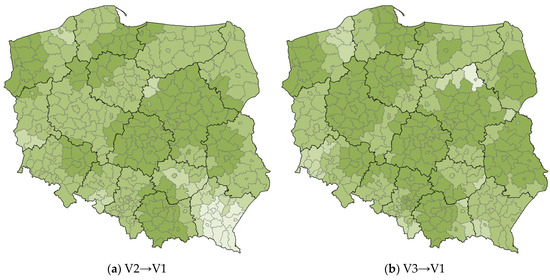 The first relationship V2→V1 indicates to what extent the explanatory variable V2 explains the dependent variable V1. In the case of this relationship, the northwestern part of the Masovian Voivodship, almost the entire area of the Subcarpathian Voivodship, and the eastern part of the West Pomeranian Voivodship can be considered as anomalies, i.e., areas with a local R2 value that differs significantly from the R2 value for the country as a whole. Analyzing the spatial distribution of counties in specific classes in relation to the overlapping voivodship boundaries, there is a great deal of similarity in the V2→V1 relationship—often voivodship boundaries coincide with class boundaries. For the second V3→V1 relationship, the extent to which the explanatory variable V3 explains the dependent variable V1 was analyzed. The northern part of Masovian Voivodship (primarily Ostrołęka County), the eastern part of West Pomeranian Voivodship, the southwestern part of Lower Silesian Voivodship, as well as the boundary counties of Lesser Poland and Subcarpathian Voivodships can be considered as anomalies, i.e., areas with a local R2 value significantly lower than the R2 value for the whole country. The last V2→V3 relationship gave very uniform results of local R2 values. The exception is the counties of Subcarpathian Voivodship, where there is a cluster of counties assigned to the lowest class of 0.00–0.40, and also none of the counties is in the highest class of 0.91–1.00.