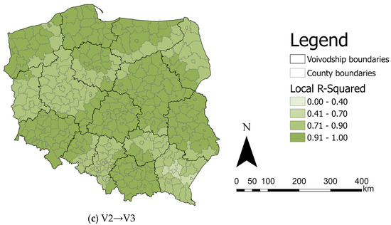 Maps of local R2 estimates for the relations: (a) V2→V1, (b) V3→V1, and (c) V2→V3. Source: own elaboration using ArcGIS Pro 3.1 by Esri.