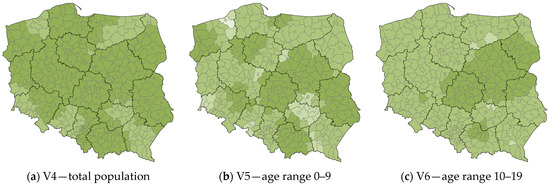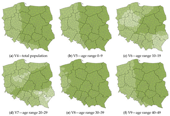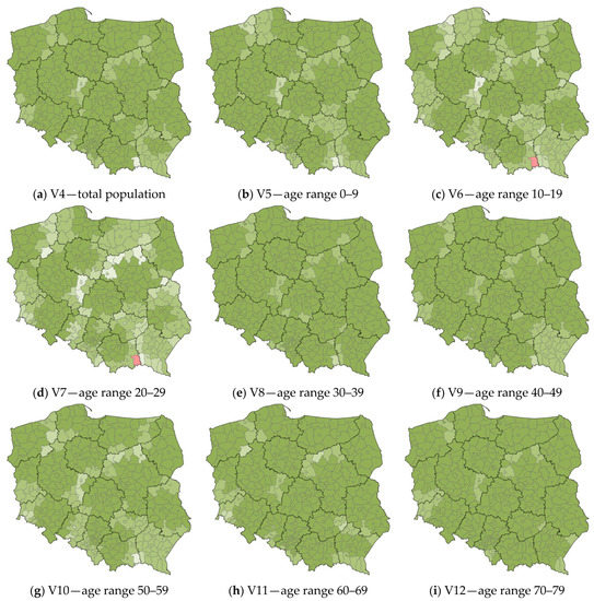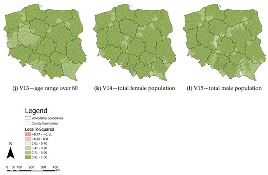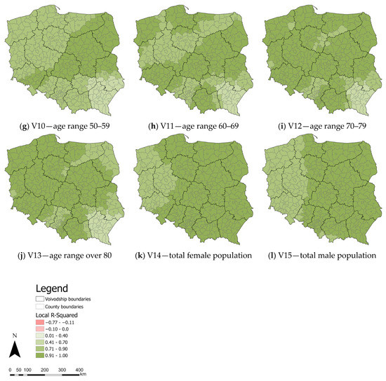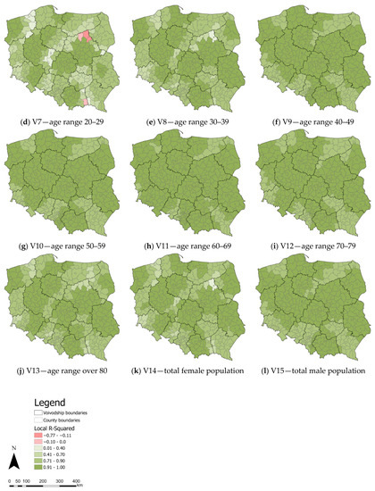 As in the case of the local R2 maps for the variables V1 and V2, the largest anomalies are observed in the map of the age range 20–29. This is most evident in the counties on the Subcarpathian and Lesser Poland Voivodship boundaries (primarily Gorlice county). Such a situation also occurs in the north and west of Masovian Voivodship (Ostrołęka County, Mława County, Płock County, and Żuromin County), the eastern part of Masovian Voivodship (Łosice County), the southeastern part of Greater Poland Voivodship, and the southeastern part of West Pomeranian Voivodship (mainly Wałcz County).