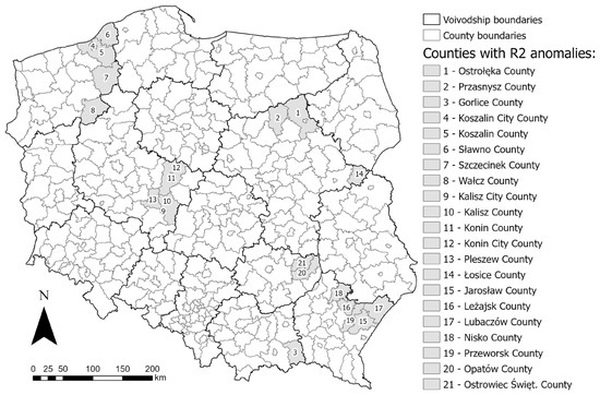 The “Results” chapter presents the raw results. By taking a comprehensive view and looking at the results in a broader way, a deeper discussion can be made that combines elements of all the variables analyzed. A comprehensive analysis of the studied variables also makes it possible to identify age ranges where the anomalies are repeated. Such a look at the results of the local R2 makes it possible to identify the age ranges that deviate most from the picture of the country’s demography. In the case studied in the article, this is noticeable in the 20–29 age range (Figure 6d, Figure 7d and Figure 8d). In this age range, this is particularly evident for the explanatory variables V1 and V3, and also partially confirmed for variable V2. For the dependent variables V1 and V3, areas located in the north of Masovian Voivodship (Ostrołęka and Przasnysz counties), bordering counties of Lesser Poland and Subcarpathian Voivodship (primarily Gorlice county), the eastern part of the West Pomeranian Voivodship (the counties of Koszalin City, Koszalin, Sławno, Szczecinek and Wałcz), the southeastern part of the Greater Poland Voivodship (the counties of Kalisz City, Kalisz, Konin City, Konin, and Pleszew), and the eastern part of the Masovian Voivodship (Łosice County) can all be considered as anomalies. In the case of the V2 dependent variable, other counties with local R2 anomalies can be identified. These are located in the southeastern part of the country: the northern part of the Subcarpathian Voivodship: Jarosław County, Leżajsk County, Lubaczów County, Nisko County, and Przeworsk County, and the eastern part of the Holy Cross Voivodship: Opatów County and Ostrowiec Świętokrzyski County. These counties do not stand out in the data input maps (Figure 3), confirming the influence of demographic factors on the explanatory variables. The location of the listed counties is shown in Figure 9. This type of research allows pandemic prevention measures to be targeted to a specific age group in specific areas. Such focused efforts can allow, above all, to optimize the costs of prevention activities.