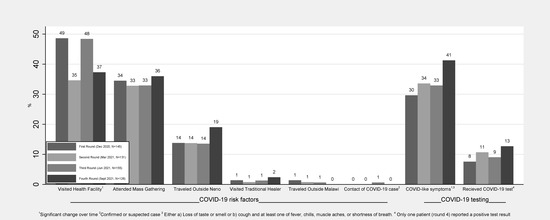 In all four rounds of data collection, the most commonly reported COVID-19-related risks experienced by patients in the past two weeks were visiting the health facility (range: 35–49%), followed by attending mass gatherings (range: 33–36%) and travelling outside Neno (range: 14–19%). Visiting traditional healers, travelling outside Malawi, or being in contact with a COVID-19 case were rarely reported. Only the proportion of patients who reported visiting health facilities changed significantly over time (p < 0.0183). In the first round, one-third (30%) of participants reported having ever experienced COVID-like symptoms, and this increased to 41% in the fourth round (p < 0.0132). Only 13% of the participants in the fourth round reported ever receiving a COVID-19 test at any point in the study, and only one patient in the fourth round reported testing positive. Statistically, we found no significant change over time regarding receipt of COVID-19 testing (Figure 1).