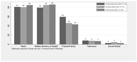 Respondents most commonly cited the radio (range: 81–85%), Malawi Ministry of Health (range: 79–86%), and friends or family (range: 43–59%) as sources of COVID-19 knowledge, while television (range: 7–8%) and social media (range: 3–5%) were the least common sources of knowledge (Figure 3). In addition, respondents citing family or friends as a source of COVID-19 knowledge reduced significantly over time (p < 0.0093).
