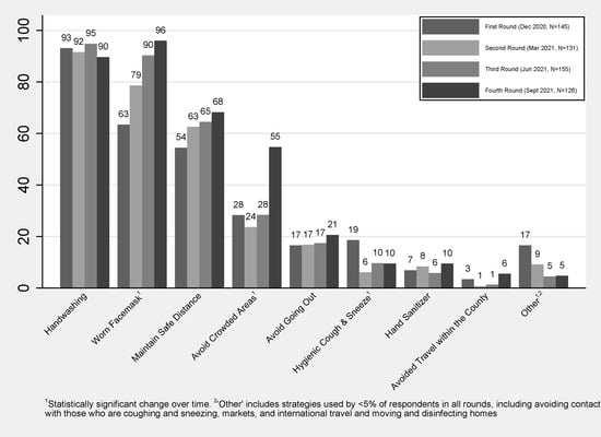 The most commonly practised infection prevention strategies were washing hands (range: 90–95%), wearing facemasks (range: 63–96%) and maintaining a safe distance (range: 54–68%). The adoption of wearing facemasks and avoiding crowded areas increased over time (p < 0.001). Hygienic coughing and sneezing significantly decreased over time (p < 0.0072). In all four rounds, less than a quarter of households reported avoiding going out, using hand sanitizer, and avoiding within-country travel, with no significant changes over time (Figure 4). The use of infection prevention strategies classified as “other” dropped significantly from 17% to 5% over time (p < 0.0013).