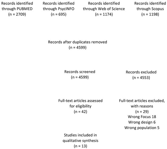 The searches identified 5776 primary studies; duplicates between the databases were checked (1177, 20.38% of the total studies). The remaining 4599 papers were screened for titles and abstracts to assess whether the topics were likely to agree with the aim of the review. 46 studies were selected for full-text reading, which was reduced to 13 by excluding papers with a wrong focus (e.g., not including gender-based violence or decision making; n = 18), wrong design (e.g., reports or case studies; n = 6), or wrong population (e.g., children or adolescents; n = 5) (Figure 1).