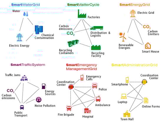 Each one of these grids corresponds to an urban system, which, in turn, consists of a multitude of interwoven nodes (Figure 2). These systems, which are equipped with sensors, are in communication with each other through a network that allows information management and decision making. The purpose of this organisation of the network, multiscale or fractal, is to facilitate governance and to efficiently respond, in real time, to the constant flow of social demands. The Smart City is a network of networks that changes, mutates, and is in constant movement. Based on the persistent needs of society, it also adapts, incorporates new layers, modifies existing ones, builds new networks, and creates unsuspected landscapes []. In a few years’ time, the services necessary to satisfy the demands and needs of the increasingly ageing population will constitute a new layer of the Smart City that must be designed and planned.