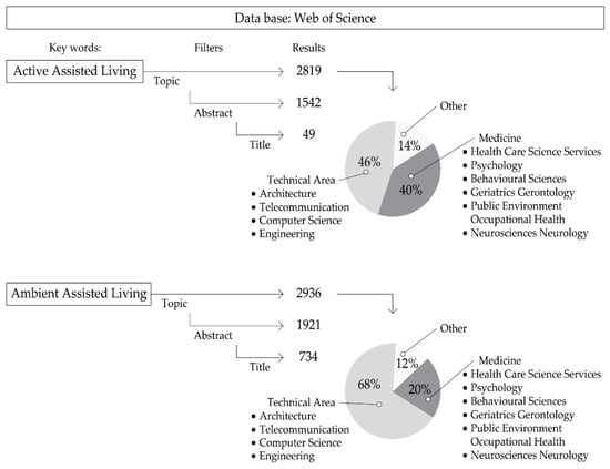 During the execution of the above method, some outcomes could be perceived as an advancement of the results section. As a consequence of the scoping searches, a selection of the main publications were examined, and it quickly became apparent that a huge amount of literature mentioned the main terms. Nevertheless, just a few publications present the concept or syntagm Active Assisted Living. Around 40% of the existing publications came from the Medical discipline, and more than 45% of those were from a technical standpoint. However, in technical disciplines focused on the field of architecture and related to the AAL concept, which is still in its infancy, there is no canonical work to date. The literature selected and evaluated in the architectural field was mainly composed of articles with open access and high impact, which can be found in the bibliography of this paper. This review article is a starting point and identifies a potential opportunity for contemporary research.